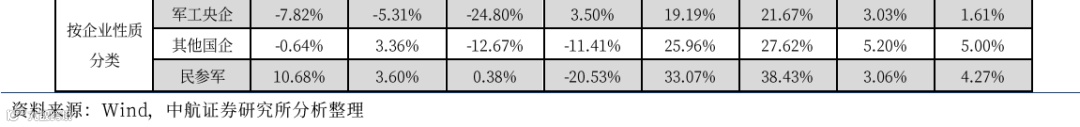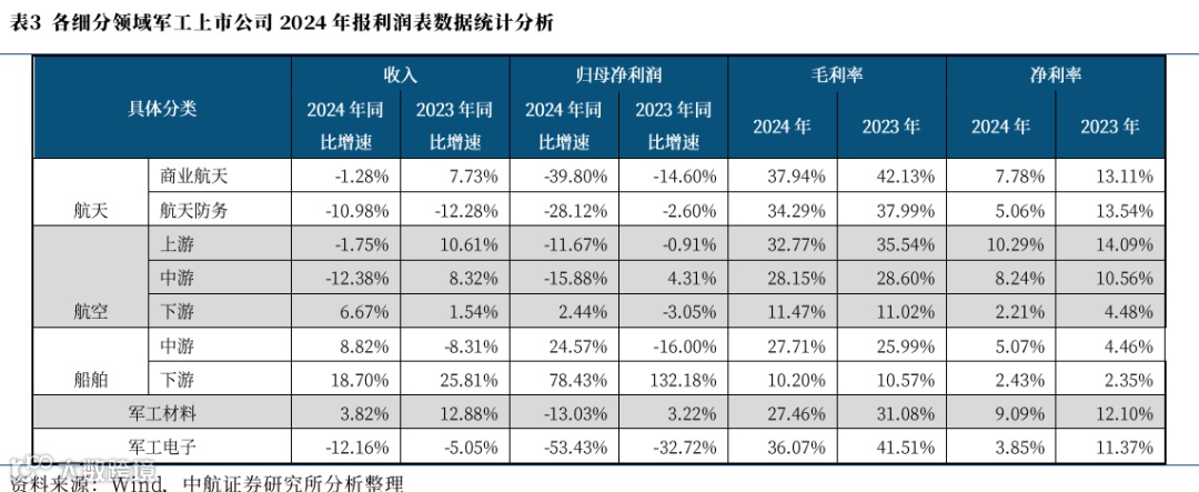 截至2025年4月30日,军工板块2024年年报已披露完毕,在239家军工板块上市公司中,88家公司2024年报归母净利润同比实现增长,151家公司2024年报归母净利润同比下降。我们分别通过对76家军品业务占比相对较高,且财务数据具有可比性的军工上市公司、以及对不同企业属性(军工央企,其他国企以及民参军企业)、细分领域(航空、航天、船舶、材料、电子)分类进行统计,可以得到几个重要表现,包括: