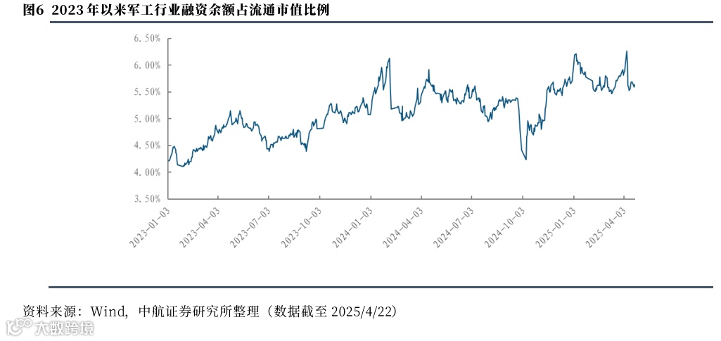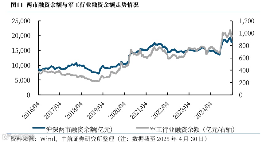 截至2025年4月29日,军工行业的融资余额合计944.10亿元,比上周环比将减少1.20%,占两市融资余额比例为5.29%。
