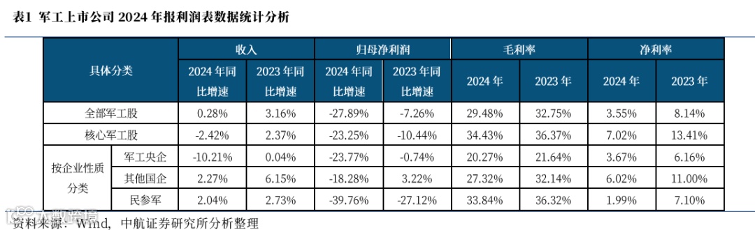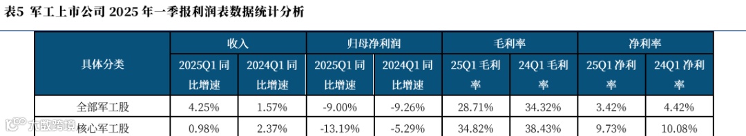 ① 2025年一季度军工企业收入进一步放缓,归母净利润出现负增长。对核心军工股进行统计,2025年Q1收入同比增速中位数由2024年Q1的2.37%下降至0.98%、净利润增速中位数由-5.29%下降至-13.19%;