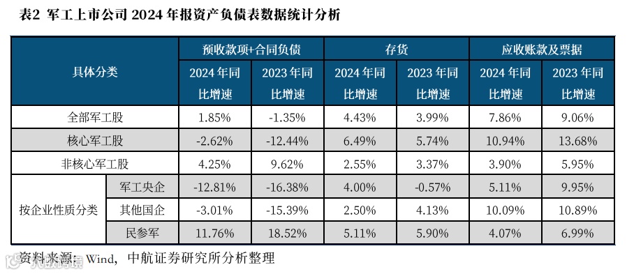 ① 2023年、2024年核心军工企业预收款项与合同负债连续出现负增长(-12.44%、-2.62%),显示短期需求不足。