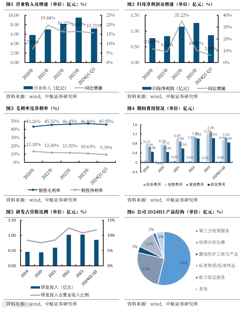公司2024年前三季度营业收入(7.22亿元,+15.71%)有所提高,归母净利润(0.87亿元,+5.89%)也保持增长,主要得益于公司业务向各下游领域的持续渗透、检测业务布局的扩大以及产品技术水平的提升。毛利率(45.95%,-2.45pcts)有所下降,而净利率(9.39%,-0.63pcts)降幅收窄。