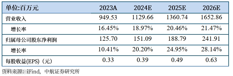 基于以上观点,我们预计公司2024-2026年的营业收入分别为11.30亿元、13.61亿元、16.53亿元,归母净利润分别为1.51亿元、1.89亿元、2.42亿元,EPS分别为0.39元、0.49元、0.63元,维持“买入”评级,目标价15.50元,对应2024-2026年PE分别为40倍、32倍、25倍。