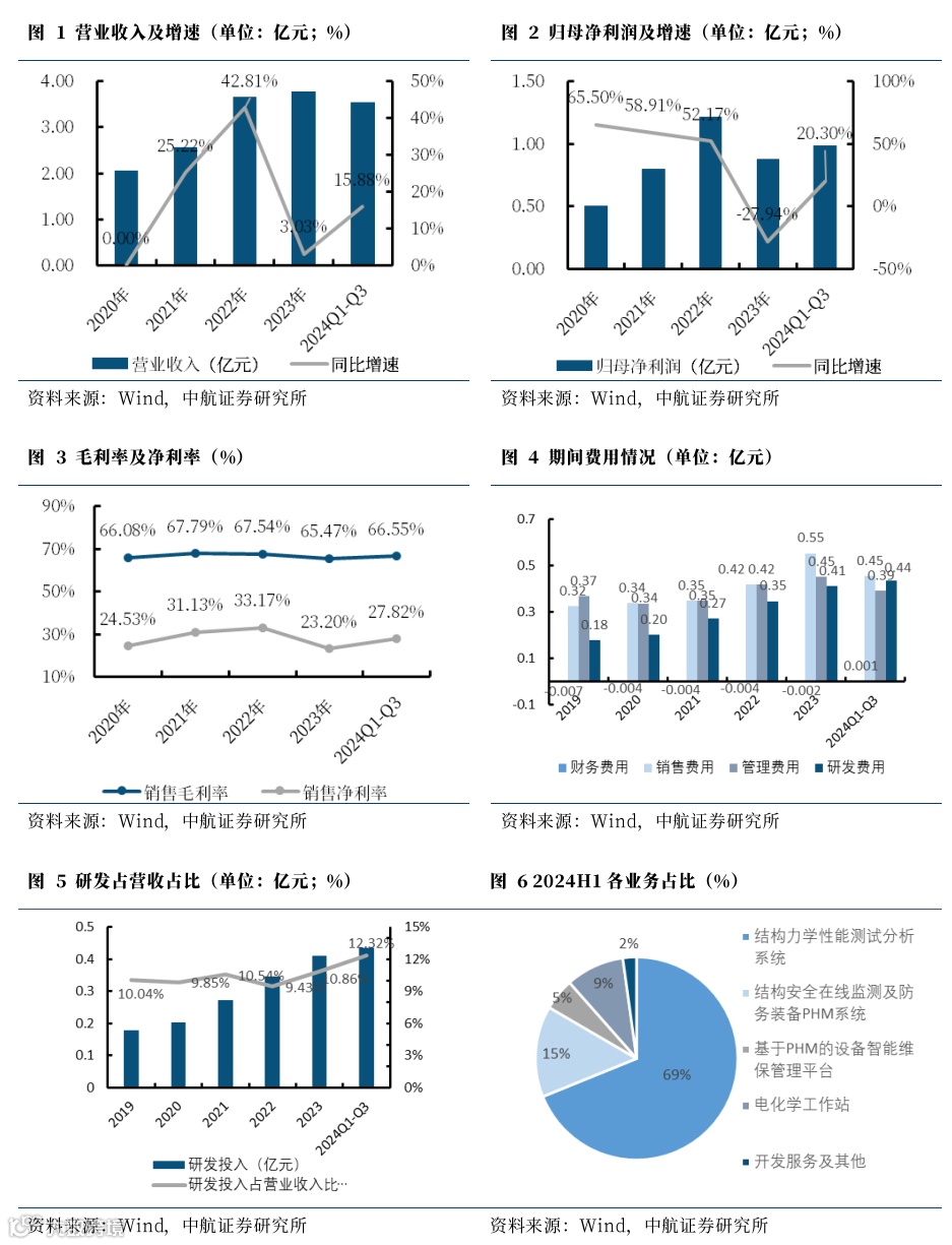 公司专注于智能化测控系统的研发和生产,拥有结构力学性能测试分析系统、结构安全在线监测及防务装备PHM系统、基于PHM的设备智能维保管理平台、电化学工作站四大类产品线,而自定义测控分析系统、实验与仿真融合分析平台两大新产品的研发与落地,进一步丰富了公司的产品线。公司业务覆盖航空航天、国家重大装备领域、机械制造、交通能源以及高校等行业,其中军工客户业务占比超50%以上,是公司主要收入来源。