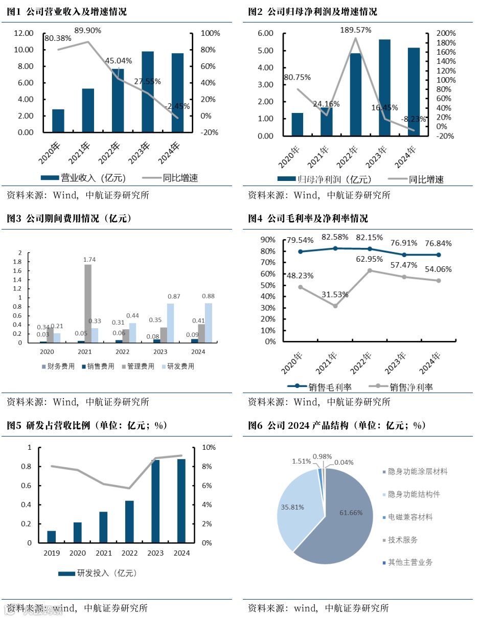 我国主要的电磁功能材料与结构(EMMS)提供商。公司于2024年12月在科创板上市,始终专注于装备隐身、电磁兼容等领域的技术研发,产品涵盖隐身功能涂层材料、隐身功能结构件、隐身维护材料、电磁兼容材料,此外,公司新布局的新一代电波暗室总体设计集成及关键吸波材料产品在低频性能、使用寿命、运维成本方面有显著优势,同时材料阻燃性能优异。公司产品以军用产品为主,主要应用于航空领域,同时已布局舰船、航天、兵器等领域重点型号和重点产品,并加大这些领域的市场开拓力度,此外,公司积极完善民品市场业务布局,实现电磁兼容材料在消费电子、汽车电子等重点领域的业务突破。
