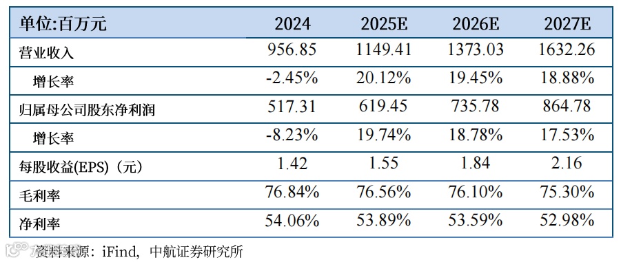 我们预计公司2025-2027年的营业收入分别为11.49亿元、13.73亿元和16.32亿元,归母净利润分别为6.19亿元、7.36亿元和8.65亿元,EPS分别为1.55元、1.84元和2.16元,我们给予“买入”评级,目标价62元,对应2025-2027年预测EPS的40倍、34倍及29倍PE。