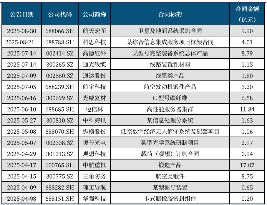 2025年以来,多家航空航天领域中上游上市公司公告了重大合同或中标通知书,具体如下表所示。