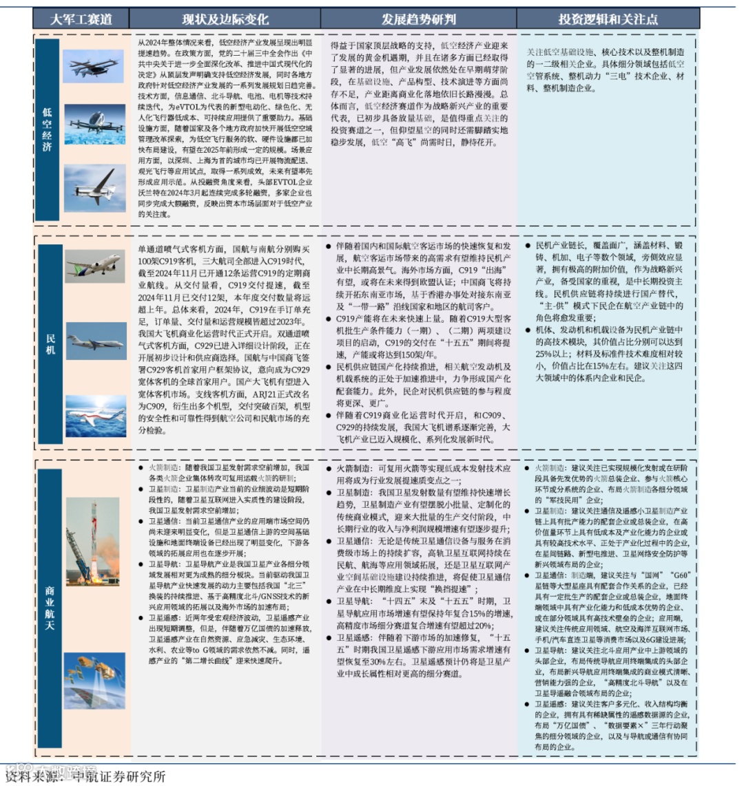 4、 关注低空经济、民机、商业航天、深海、军贸、信息安全等军民结合领域的“大军工”投资机会;