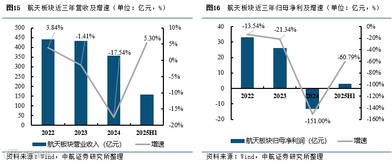 2025年上半年军工上市公司航天板块合计实现营业收入(157.00亿元,+5.30%),归母净利润(2.98亿元,-60.79%)。