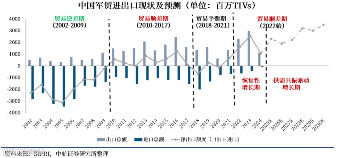最近两年来,随着国际局势的波云诡谲,俄罗斯等传统军贸大国的出口缩减,同时受益于我国国防科技工业体系的完善和国产替代能力的提升,我国军贸出口量显著增长,带动净出口额显著提升。我国或将进入下一个贸易顺差期。