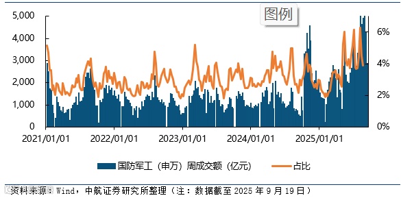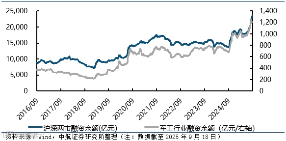 截至2025年9月18日,军工行业的融资余额合计1212.73亿元,比上周环比上升0.08%,占两市融资余额比例为5.10%。