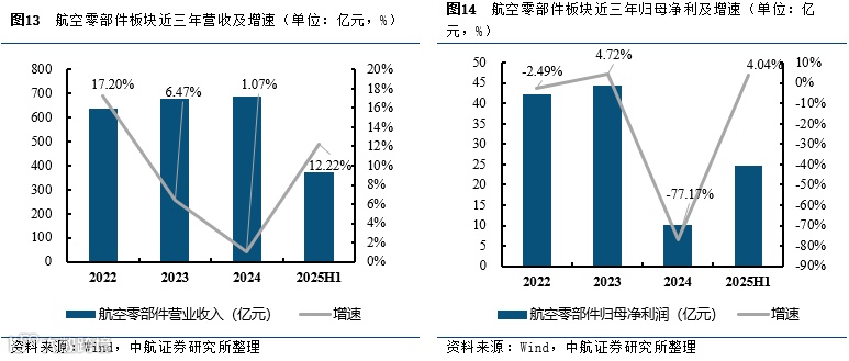 2025年上半年军工上市公司航空零部件(包含锻造、机加工、增材制造等)合计实现营业收入(373.89亿元,+12.22%),归母净利润(24.59亿元,+4.04%)。