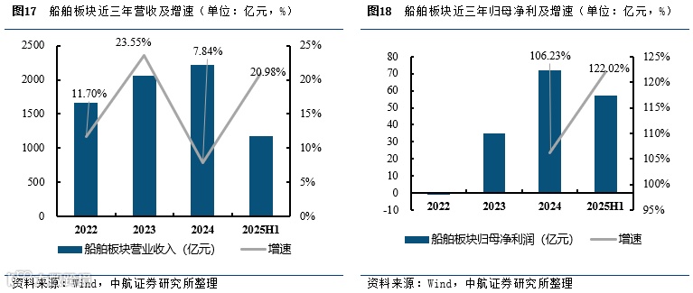 2025年上半年军工上市公司船舶板块合计实现营业收入(1181.68亿元,+20.98%),归母净利润(57.03亿元,+122.02%)。船舶行业整体保持较高的景气度,需求及民品船舶价格提升,助推船舶板块营收利润保持高速增长。