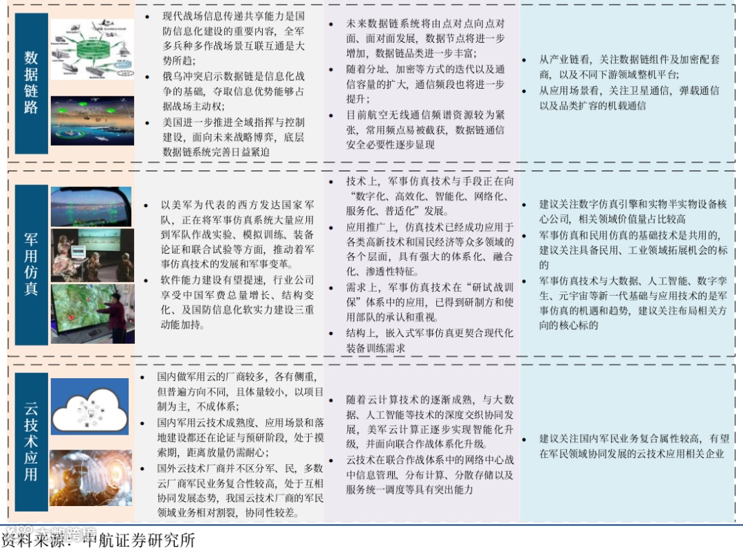 ③ 新域新质赛道:主要包含以无人装备、卫星互联网、电子对抗、数据链路、军事仿真以及云技术等新战争形态下,以“智能化、体系化、信息化”为代表的军工细分领域,这些领域往往已经受到海外军事强国的重视或已经在战场上得到了实战验证,在国内往往处于早期萌芽发展阶段,但应用发展确定性相对较强。新域新质各细分领域在“十四五”末,乃至“十五五”时期都有望具有较大发展弹性,将有望成为军工板块在未来中长期持续高景气发展的新驱动力。
