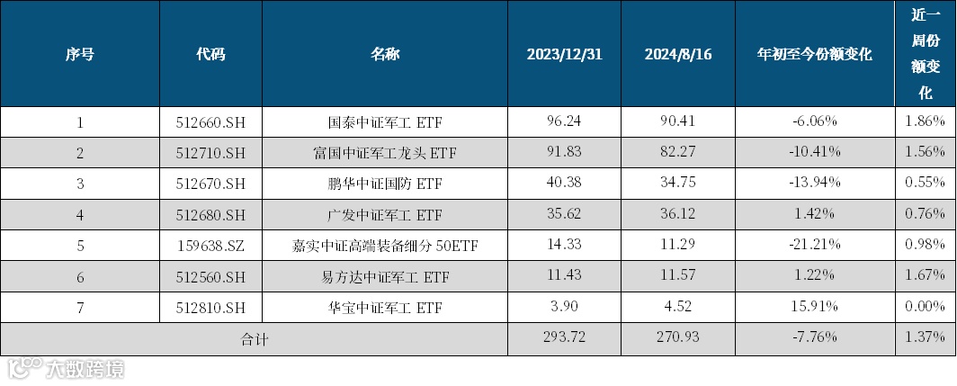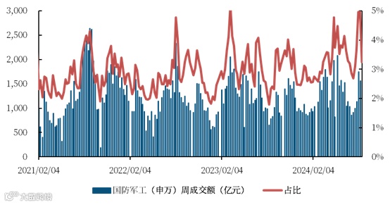 本周,军工板块(申万)成交额为837.94亿元(-46.39%),占中证全指成交额比例为3.25%(-1.72pcts),主要军工ETF基金份额环比上周增加1.37%。