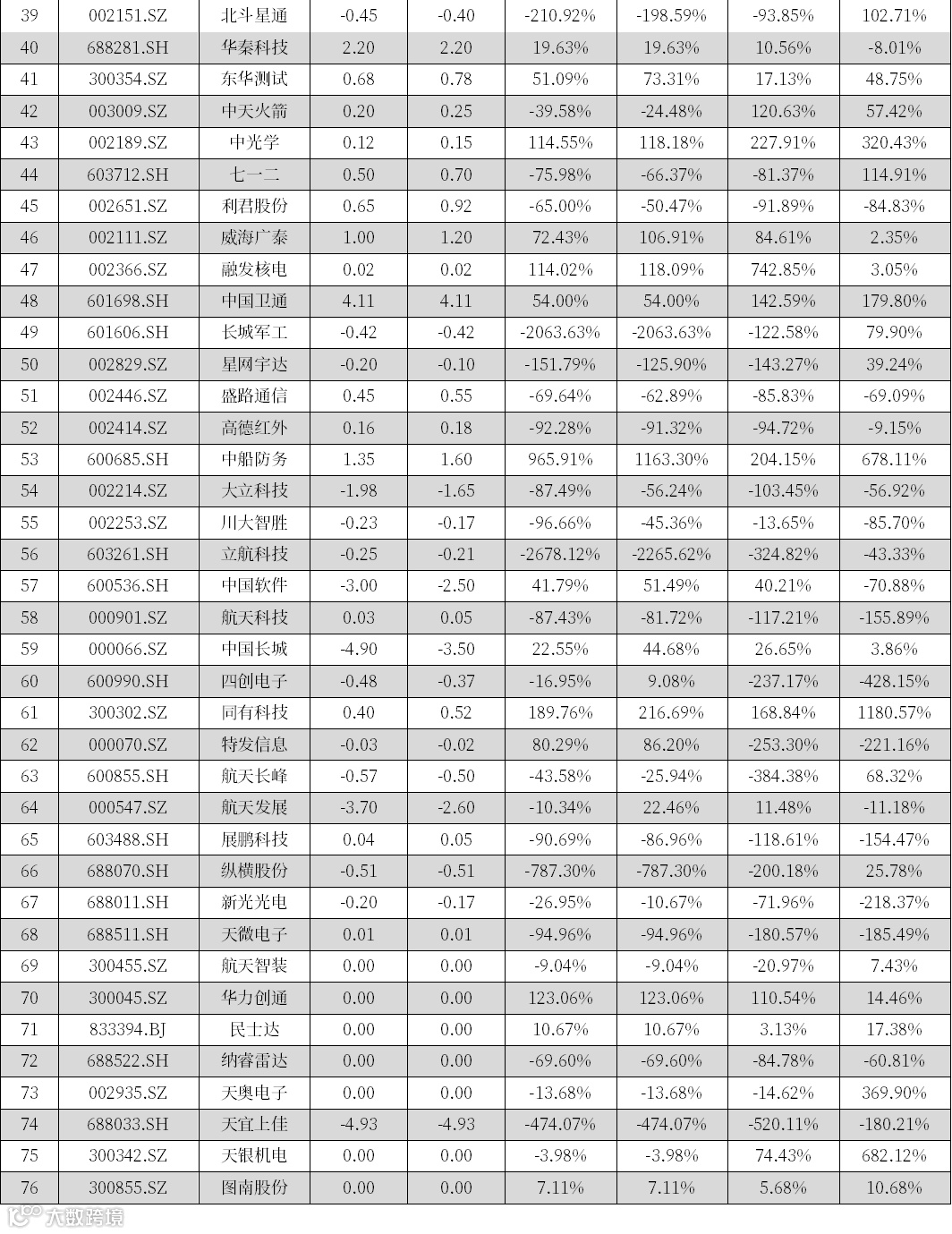 跌幅前五:航天科技(-16.25%)、锴威特(-12.79%)、利君股份(-11.73%)、华秦科技(-9.81%)、航天宏图(-9.77%)。