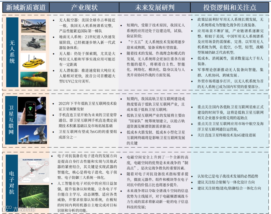 ③ 关注无人装备、卫星互联网、电子对抗等新质新域的投资机会;