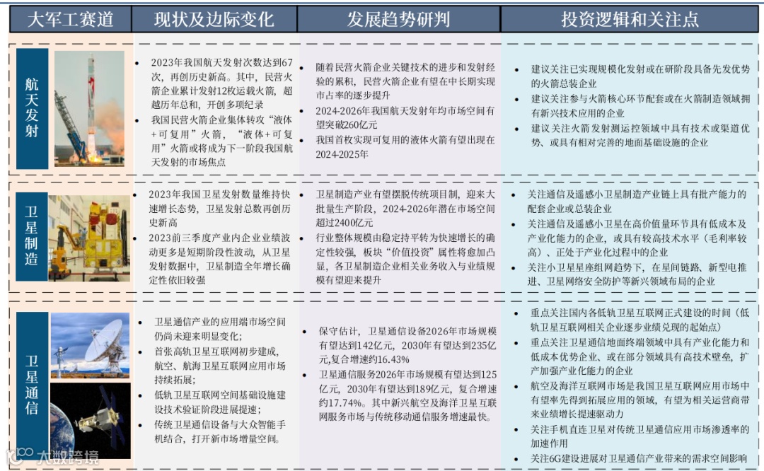 ② 大军工赛道:主要包含以军贸、民机、低空经济、航天发射、卫星制造、卫星通信、卫星导航、卫星遥感、民船以及信创等十个“大军工”产业细分领域。所谓“大军工”,是指当前军工行业的范畴已大为拓展,特别是军技民用下广义概念下扩充的军工新赛道。这些领域或已具有一定规模或仍在快速发展阶段,是支撑军工行业持续高景气发展的第二曲线。