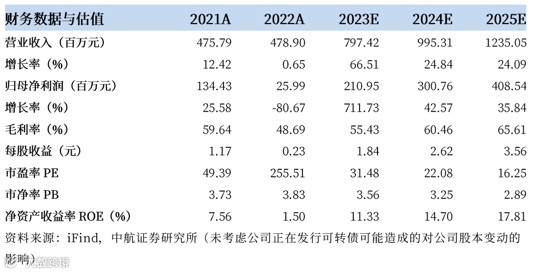 基于以上观点,我们预计公司2023-2025年的营业收入分别为7.97亿元、9.95亿元和12.35亿元,归母净利润分别为2.11亿元、3.01亿元及4.09亿元,EPS分别为1.84元、2.62元、3.56元,我们维持买入评级,目标价为60.00元,分别对应33倍、23倍及17倍PE。