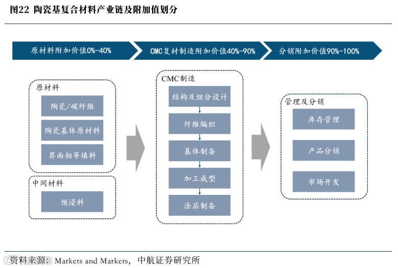 从各环节的价值划分来看,原材料和陶瓷基复合材料制造业务分别创造了行业内40%和50%的附加值。纤维、基体等原材料和成品制备工艺一样具有较高的技术门槛和附加值,目前,我国纤维自主生产能力处于追赶阶段,因此受国外供应商影响较大。部分情况下纤维采购成本占总成本50%以上。