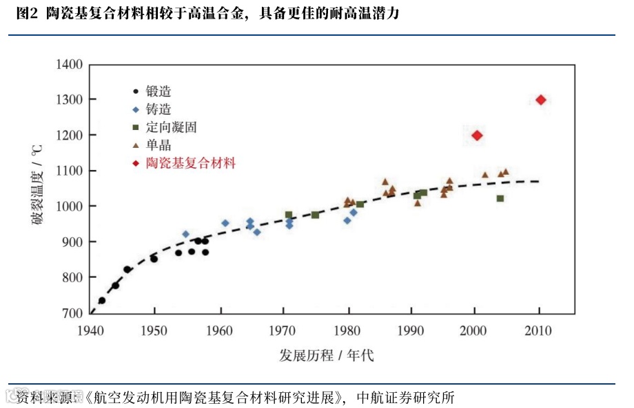 在上一阶段的高端装备新材料发展中,高温合金在航空、航天、核能等领域的热端部件有着统治性的地位,但随着各领域技术发展对于材料的耐热性需求的提升,终端应用工况对耐高温等性能的需求逐渐超过了高温合金的性能范围,陶瓷基复合材料成为了下一阶段耐热材料的发展首选。陶瓷基复合材料突破了高温合金迭代过程中每10年增加35°C耐温极限的缓慢提升趋势,带领热端材料进入了新的性能高度。