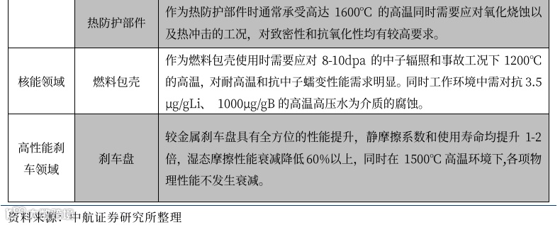 陶瓷基复合材料的纤维选择普遍对应终端应用的性能需求,以碳化硅陶瓷基复合材料为例,利用碳纤维增韧的Cf/SiC在耐高温性能上较碳化硅纤维增韧的SiCf/SiC有优势,由于碳纤维本身的特性抗氧化性较SiCf/SiC有差距。因此热能更高且无氧的环境更适合Cf/SiC材料的应用,与之相比抗氧化性更好且有良好耐中子辐照性能的SiCf/SiC在航空发动机和核能领域的应用更为广泛。