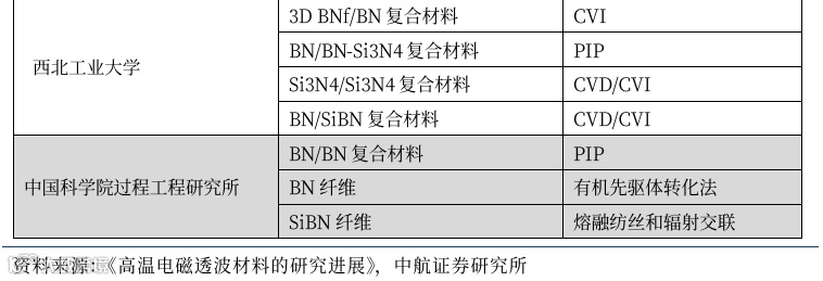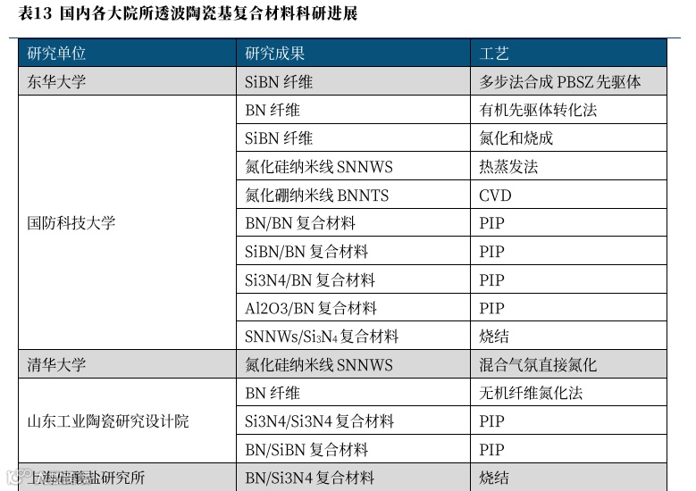 目前,石英纤维是目前商业化程度及产量最高的耐高温透波纤维,但石英纤维耐温性能较差,在温度超过 1150 ℃时会发生析晶现象,导致强度急剧下降,难以应用于较高温度的服役环境。以石英纤维的性能限制为切入点,国防科技大学、中科院上海硅酸盐研究所、山东工业陶瓷研究设计院、西北工业大学等高校和院所对氮化硼、氮化硅、硅硼氮和氧化铝四种纤维,氮化硼、氮化硅和硅硼氮三种基体的陶瓷基复合材料做出了研究并取得了进展。综上所述,上一代石英纤维透波材料市场程度高,新一代高温透波陶瓷基复合材料发展即将完成从0到1的突破。