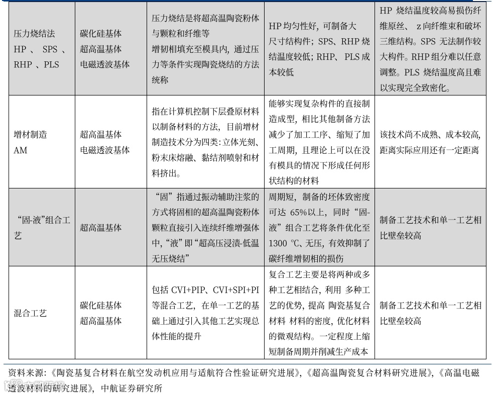 1、非氧化物陶瓷基制备工艺:以CVI、PIP、MI为主,新型混合工艺具有全面优势