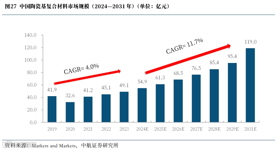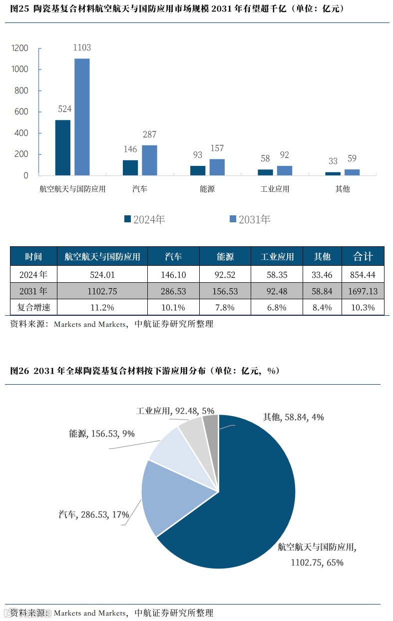 根据Markets and Markets预测,至2031年,全球陶瓷基复合材料规模有望接近1700亿元规模,复合增速超过10%。其中航空航天及国防应用增速最快,有望突破1100亿元,复合增速超11%,市场占比也有望提升至65%。