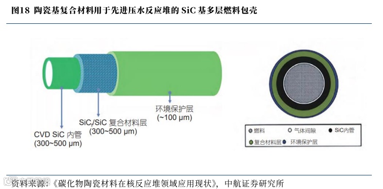 核能领域目前有部分陶瓷材料应用,陶瓷基复合材料受到广泛关注,部分陶瓷基复合材料包壳部件已取得安全审评许可有望替代锆合金。近年来,连续纤维增强陶瓷基复合材料以其轻质、耐极端高温、非脆性断裂等特性,在航空、航天等高新技术领域应用广泛,在核能领域的基础与应用研究也得到了广泛关注。