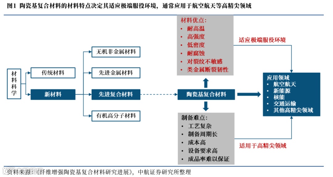 一代材料一代技术,新材料技术和产业化的突破往往会带来一场工程的变革。在各类新材料中,陶瓷基复合材料是一种全新的结构材料,以陶瓷为机体与各种纤维复合而成,保留了传统陶瓷耐高温、高强度、低密度、耐腐蚀、可设计性强的优良性能,同时具备类金属断裂韧性、对裂纹不敏感。在一些极端服役环境下,如超高温、腐蚀性强等环境,陶瓷基复合材料相较于金属材料有较为明显的优势,可较好的应用于航空航天、核能、轨道交通等高精尖领域,其发展备受关注。