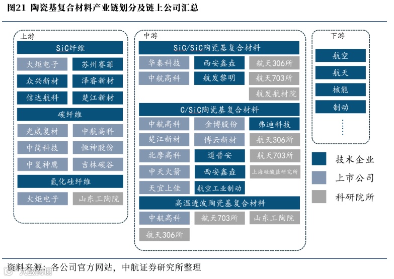 陶瓷基复合材料上游主要分为碳化硅纤维、碳纤维以及氮化硅三种纤维生产商,三类纤维材料分别对应中游的SiC/SiC、C/SiC和高温透波陶瓷基三种陶瓷基复合材料制造商。下游则主要为航空、航天、核能等领域的应用。