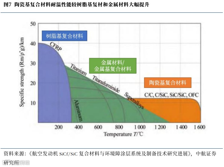 陶瓷基复合材料的诞生和发展得益于航空发动机、燃气轮机以及航天等对材料服役温度和高温下力学性质的高要求。热端材料的终端需求有效地牵引了耐热材料的不断开发和迭代。