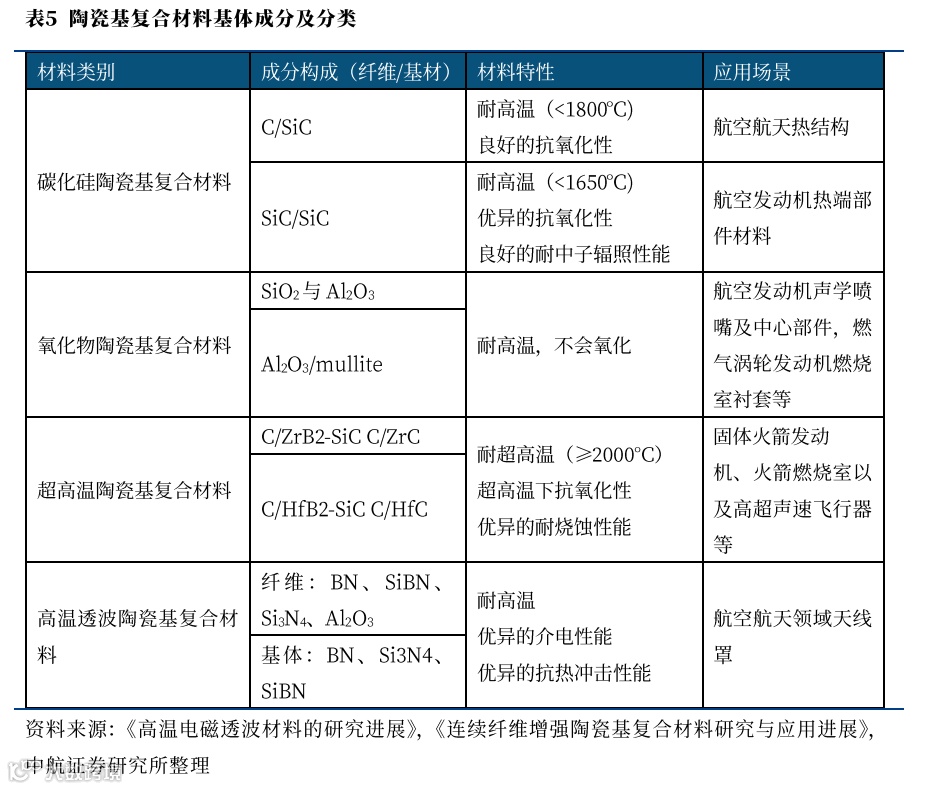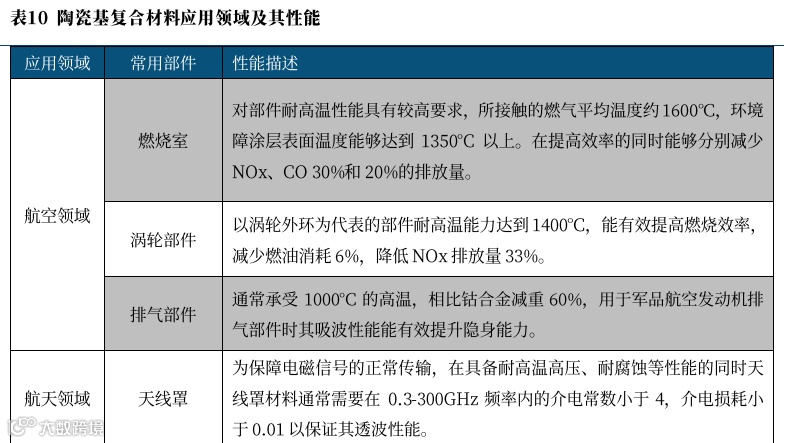 与之相比氧化物陶瓷基和高温透波陶瓷基复合材料则在耐高温的同时兼顾部分特化性能。例如氧化物陶瓷基复合材料在吸波性能上较传统高温合金材料有优势因此应用于航空发动机尾端排气部件,而天线罩使用的透波陶瓷基复合材料则需要氮化硅、硅硼碳等材料作为基体。因此,陶瓷基体、性能特性和终端应用间存在较强的对应关系。