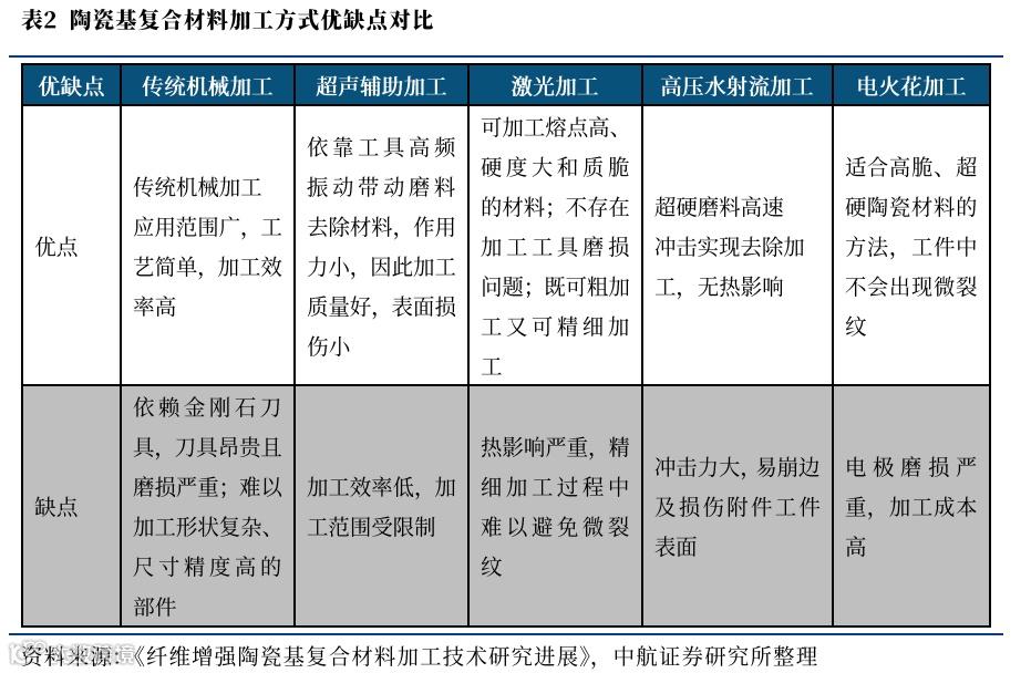 在上述制备技术的基础上,陶瓷基复合材料快速向应用推进。当然,不同的陶瓷基复合材料所采用的技术仍有较大的区别,具体制备优劣势对比于后文中展开分析。