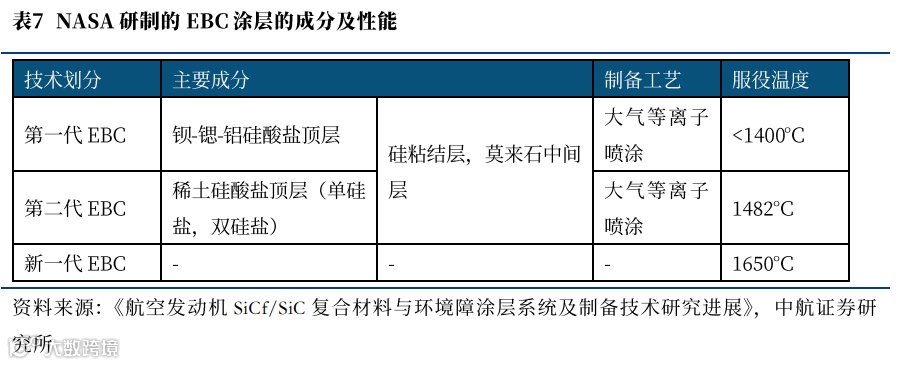 从技术开发上来看,早期的第一代涂层只能在低于1400°C的环境下生效,1999年研制的第二代EBC,具有更好的抗环境腐蚀能力和更高的耐温能力(1482°C),NASA表示希望目前在研的下一代EBC°表面温度能达到1650°C。目前我国的EBC涂层使用普遍跟随终端产品的服役环境进行调整,相关信息相对有限。