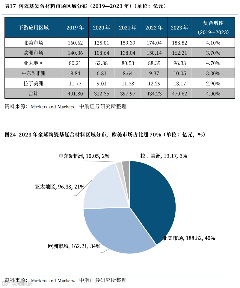 从区域分布看,北美市场及欧洲市场由于其航空航天、汽车产业较为发达,是当前陶瓷基复合材料的主要市场。2023年,北美市场陶瓷基复合材料市场规模约为189亿元,占比为40%;欧洲市场规模约为162亿元,占比为34%。亚太地区市场规模约为96亿元,占比21%。