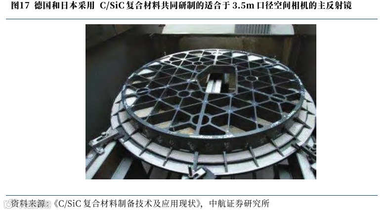C/SiC和一众陶瓷基复合材料具有质量轻、刚度高、热膨胀系数低等特点,因此在对精度要求较高的空间相机结构材料领域也有良好的应用前景。在终端应用研究方面,通过调节纤维在复合材料内部的分布,甚至能够获得热膨胀系数接近于零的 C/SiC 材料,可以极大地提高空间相机部件的尺寸稳定性。目前,国内外的相关研究都较为成熟。