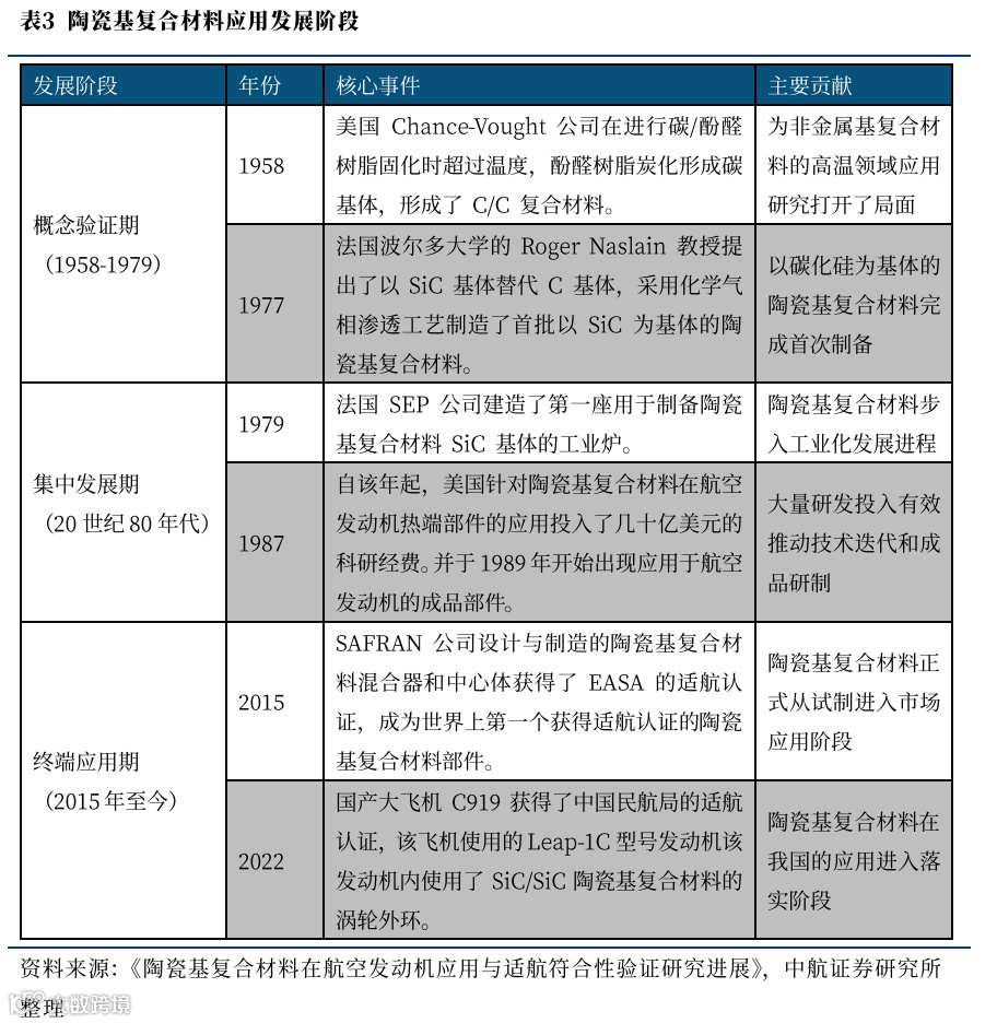 经过近几十年发展,一方面以航空航天、核能为代表的高精尖领域对耐高温结构材料、耐腐蚀材料需求日益增加,另一方面各类配套工艺设备、制备方法不断改进迭代,陶瓷基复合材料规模化应用取得了一定的成果,已成为战略性尖端材料,在航空航天、交通运输、新能源等领域实现了工程应用或工程验证,是最重要的高温热结构材料之一。