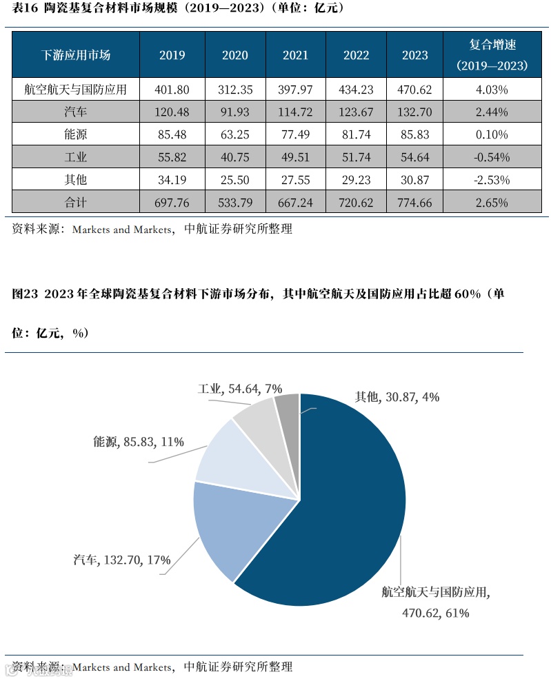 陶瓷基复合材料目前主要应用于航空航天及国防应用、汽车、能源、工业及其他领域,根据Markets and Markets的报告,2023年,全球陶瓷基复合材料市场规模预计为人民币775亿元,其中航空航天与国防应用占据市场主导地位,市场规模为471亿元,占比高达61%;汽车及能源应用次之,市场规模分别为133亿元、86亿元,占比分别为17%及11%。