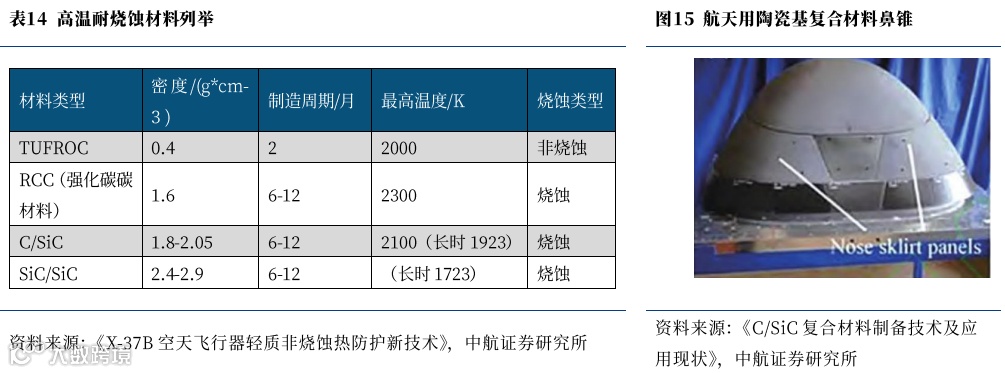 2、热防护结构:碳化硅和超高温陶瓷基在1800℃以上工况耐烧蚀能力显著