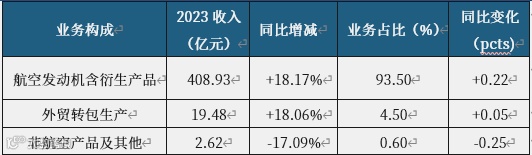 公司主要业务为包含三类,航空发动机制造及衍生产品、外贸转包、非航空产品及贸易,从业务占比上看,2023年公司整体业务结构并没有发生显著变化,波动较小。其中公司航空发动机及衍生产品业务实现收入(408.93亿元,+18.17%),完成预算值399.73亿元的102.30%,主要是客户需求增加,产品交付增加所致;外贸出口转包业务实现收入(19.48亿元,+18.06%),完成预算值16.96亿元的114.86%,主要是全球航空业复苏,出口订单增加所致;非航空产品及贸易业务实现收入(2.62亿元,-17.09%),完成预算值1.60亿元的163.75%,同比小幅下降,主要是公司民品收入减少所致。