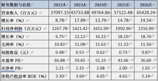 我们预计公司2024-2026年的营业收入分别497.65亿元、571.22亿元和654.28亿元,归母净利润分别为16.52亿元、19.51亿元及23.17亿元,EPS分别为0.62元、0.73元、0.87元,我们维持买入评级,目标价45元,对应2024-2026年预测EPS的73倍、62倍、及52倍PE。