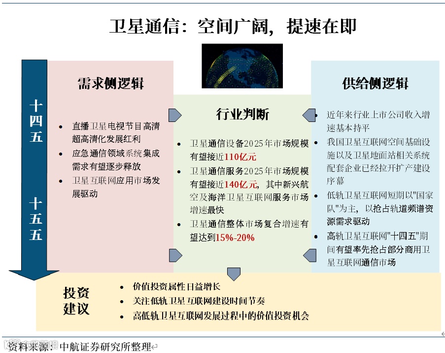 伴随“十四五”未来几年我国卫星互联网产业有望迎来快速发展,高低轨卫星互联网发展过程中也会为卫星通信产业链上众多企业带来基本面上的改善,为投资者带来更多价值投资机会。
