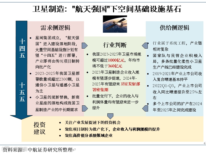 2023年,“航天强国”已经进入到建设落地阶段,作为二十大的开局之年和“十四五”承上启下的关键之年,我国有望落地更多支持航天产业发展的政策,向航天产业倾斜相对更多的资源。其中,以导弹为代表的国防安全建设重要组成、卫星为代表的空间基础设施及应用有望成为“航天强国”下的重要发展领域。各子行业的投资逻辑可以简单总结为:
