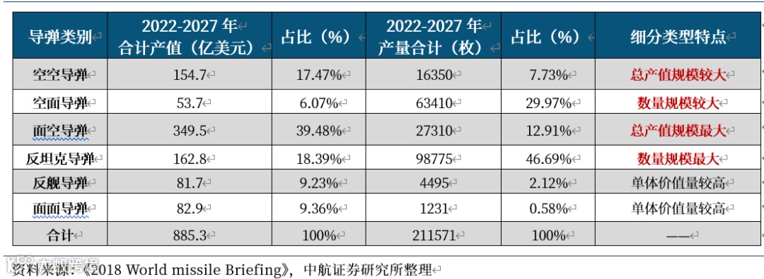 针对于数量规模或总产值规模的各类型导弹特点,我们有如下观点: