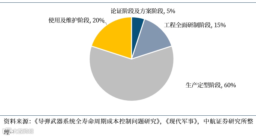 从导弹寿命周期中成本占比(见下图)可以发现,导弹的批产阶段与研发阶段的价值量存在明显差异,如工程研制阶段的成本投入基本仅为生产定型阶段的四分之一。这也直接导致导弹产业链上的企业在配套批产阶段型号和研发阶段型号时,业绩变化上也会出现差异。