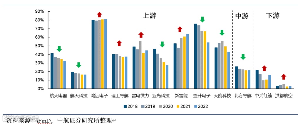 图7 导弹产业中上游部分上市公司毛利率出现缓降(单位:%)
