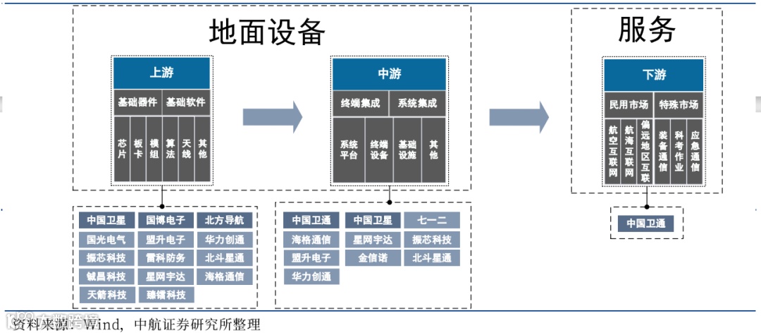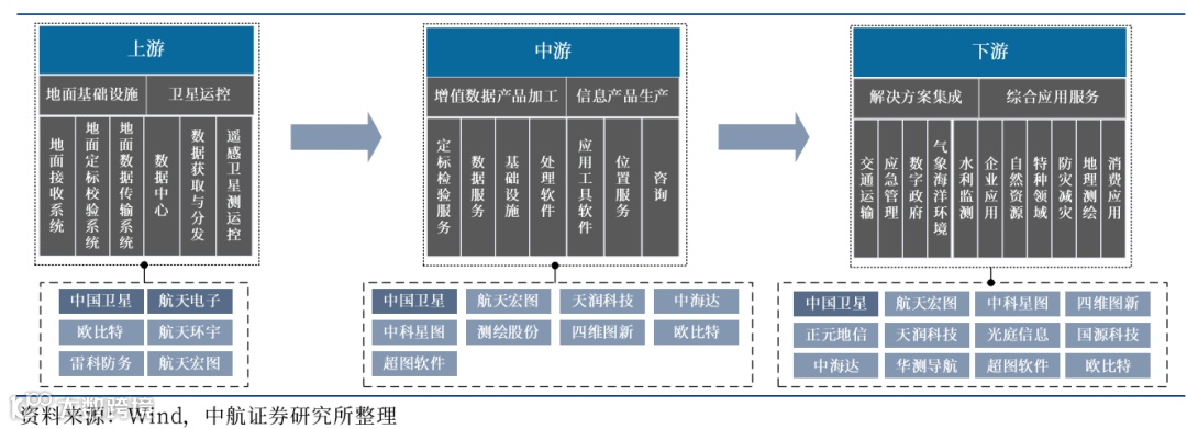 中国卫通(高轨卫星互联网)、华测导航、海格通信(北斗)、航天宏图、中科星图(卫星遥感)。