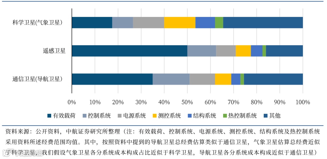 我们认为,主要原因是不同种类的卫星的成本构成差异不单单存在于不同的有效载荷上,其工作轨道带来的环境差异等也将会对卫星空间段其他分系统的性能需求产生较大影响,进而促使其成本构成较大。总体来看,各类卫星空间段分系统成本构成的共性主要在于有效载荷、控制系统、电源系统以及测控系统成本占比之和均超过50%以上。