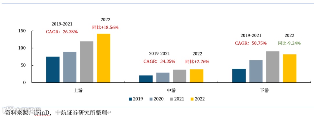 2022年,导弹产业链上游、中游及下游的上市公司收入合计增速分别为18.56%、2.26%以及-9.24%,可以看出,2022年导弹产业链上游到下游的增速呈现逐步下降趋势,其中上游和中游均维持了正增长,但下游阶段性波动显著,由2019-2021年复合50%的正增长下降至9.24%的负增长。